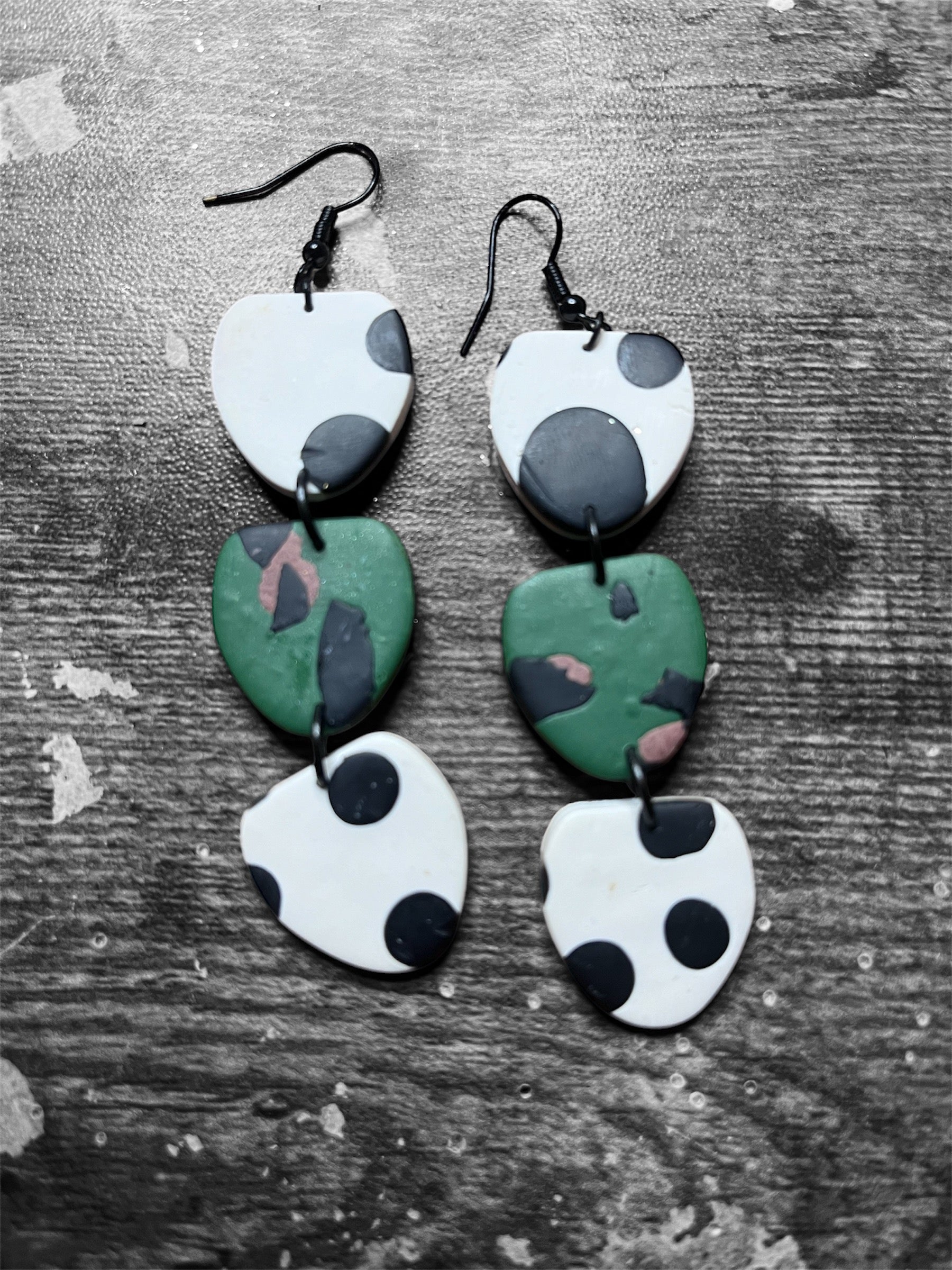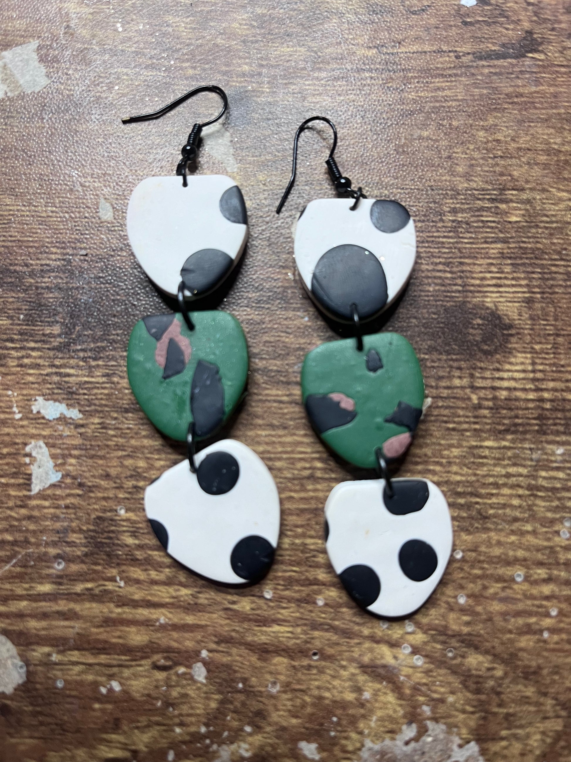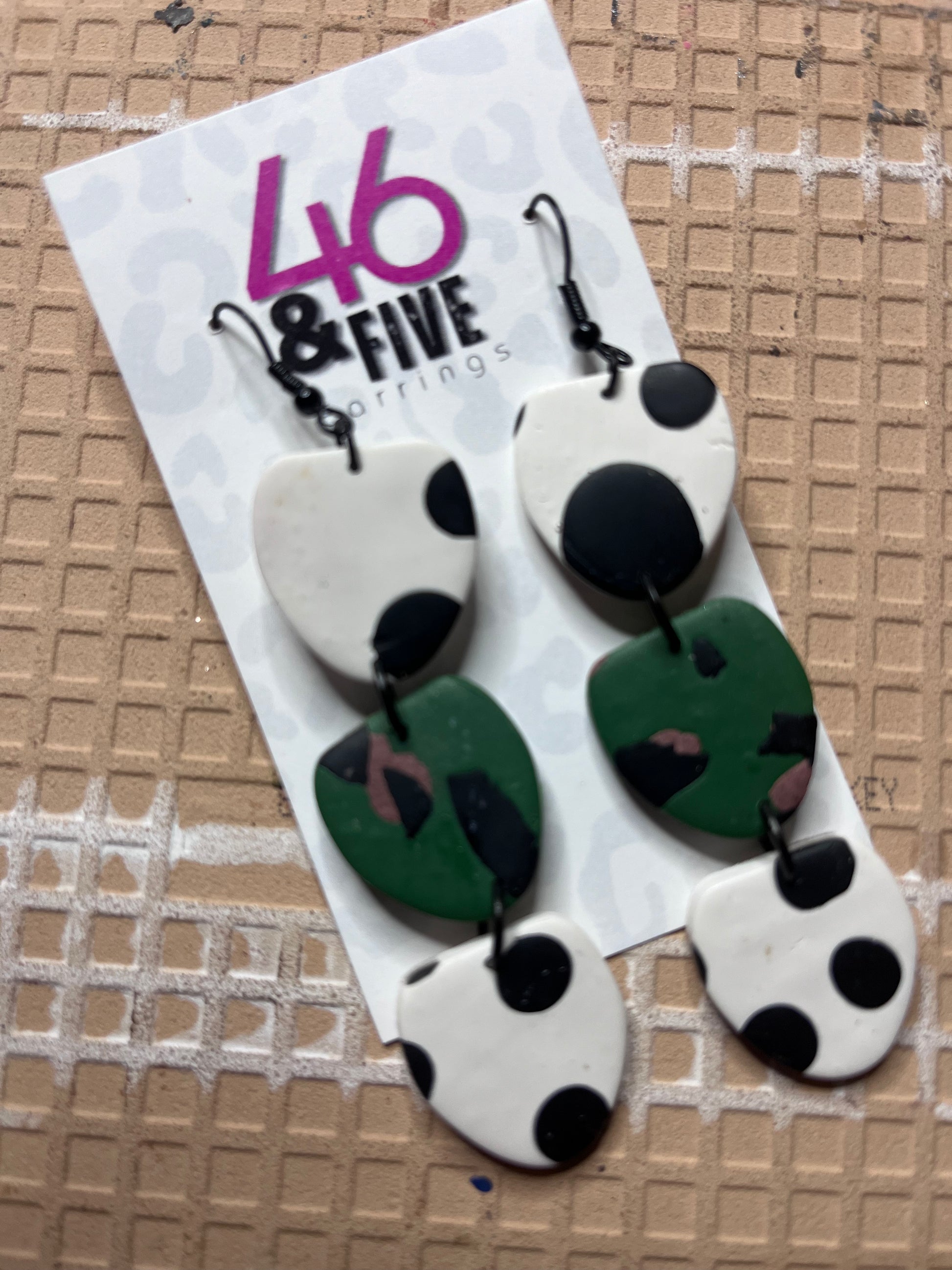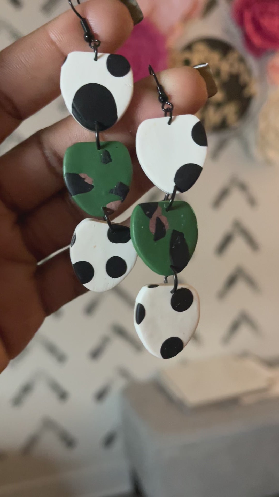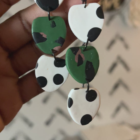 "Embrace your bold and confident side with ISA-Strong Willed earrings. Featuring a trendy contrast of green animal print and black-and-white dangles, these lightweight earrings add a touch of wild style to any outfit. At 2 1/2 inches long, they make a statement without weighing you down."